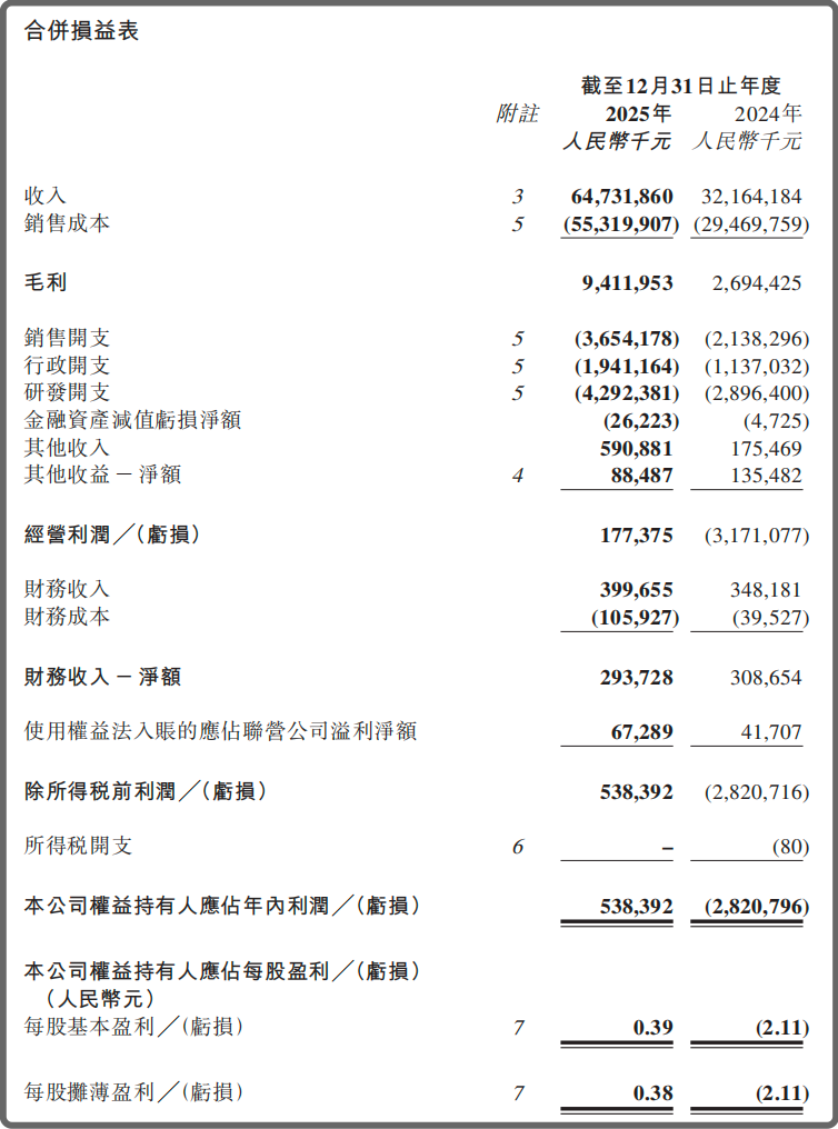 3月16日晚,零跑汽车发布了2025年业绩公告。公告显示,期内公司实现营收647.3亿元,同比增长101.3%;净利润由负转正达5.4亿元,成为第二家中国造车新势力公司全年盈利的企业;剔除以股份为基础的付款,经调整净利润(非国际财务报告准则)为10.8亿元;毛利率创年度新高达14.5%;全年累计交付596555台,同比增长103.1%,连续两年销量翻倍。