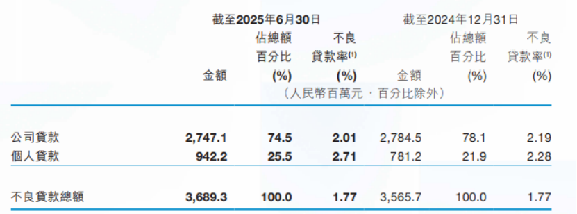 可以看到,晋商银行个人贷款不良贷款率由截至2024年12月31日的2.28%上升至截至2025年6月30日的2.71%。