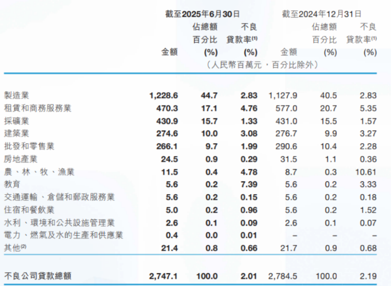 截至2024年12月31日及2025年6月30日,晋商银行制造业公司贷款的不良贷款率均为2.83%,来自该行业借款人的不良公司贷款分别占不良公司贷款总额的40.5%及44.7%,占比较高。