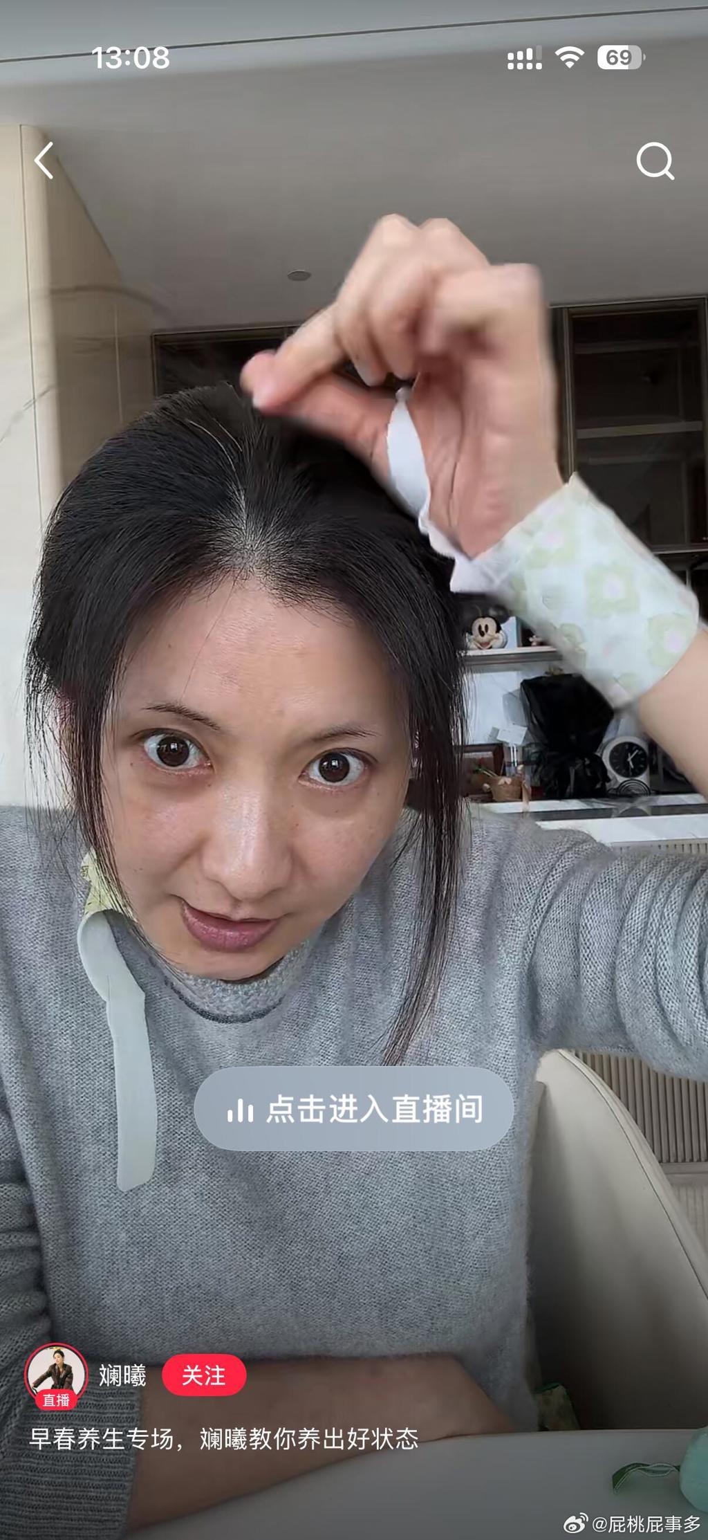 ▲斓曦将刻意镜头拉近,抓起头上白发展示。(图/微博)