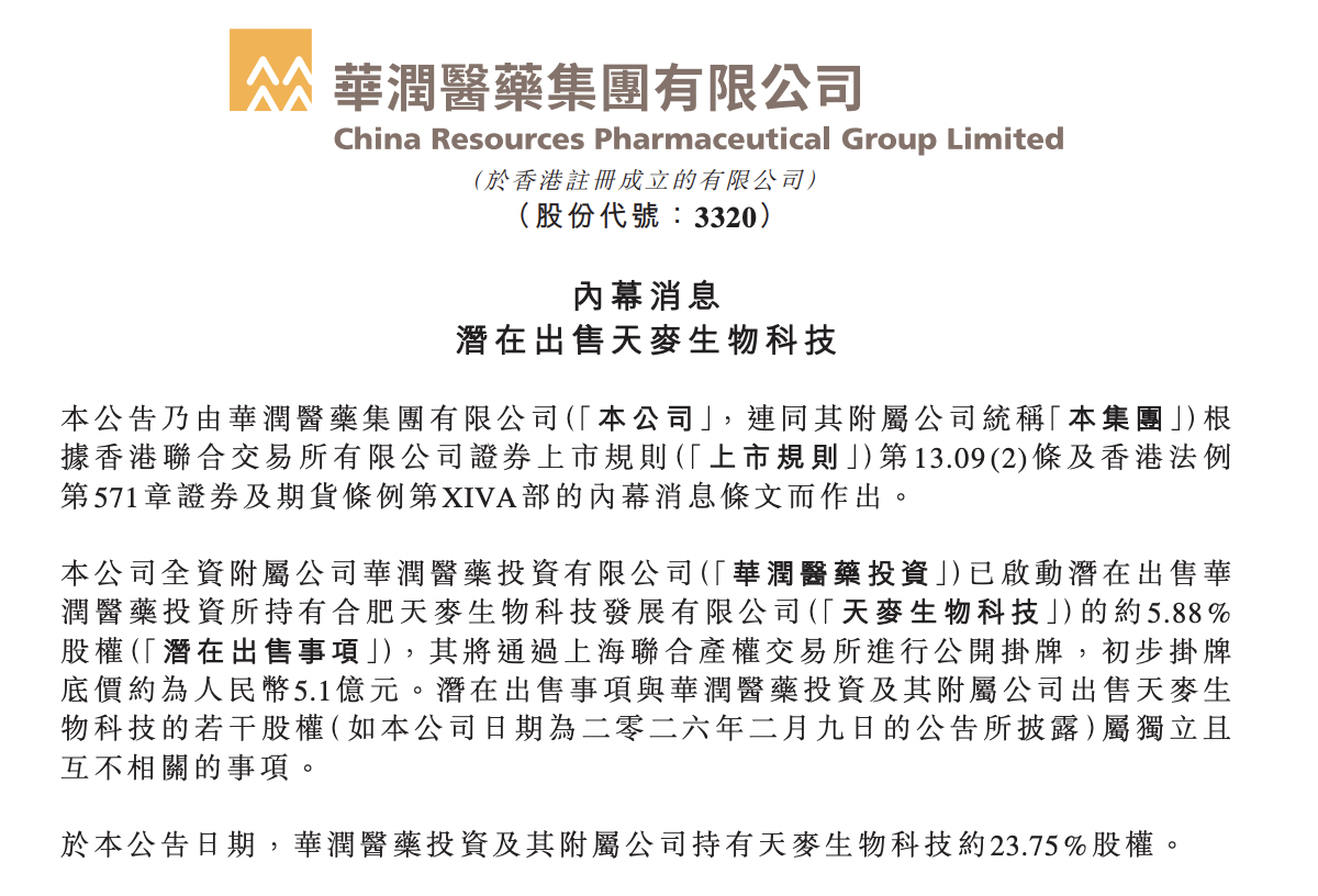 华润医药投资及其附属公司出售天麦生物科技的若干股权属( 如公司日期为2026年2月9日的公告所披露 )独立且互不相关的事项。于本公告日期,华润医药投资及其附属公司持有天麦生物科技约23.75%股权。