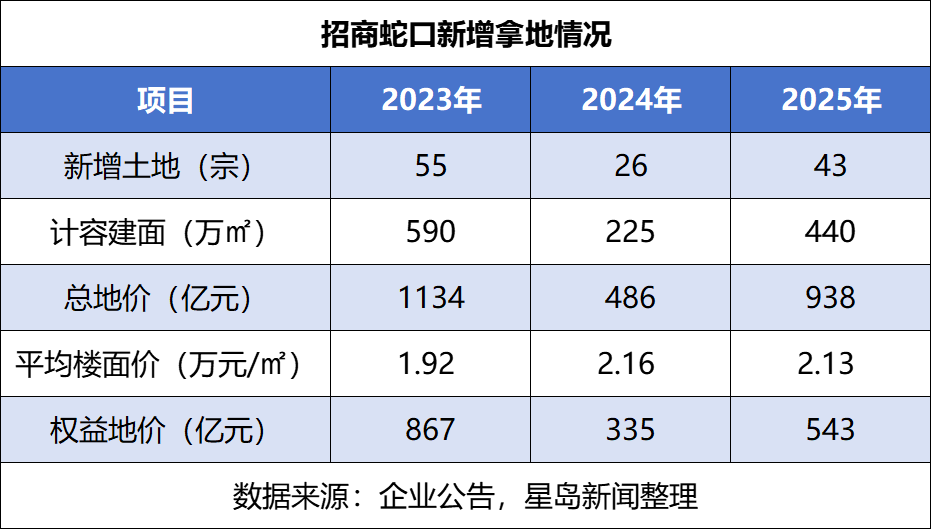 从拿地情况来看,招商蛇口近年来是投资最积极的房企之一。据《星岛》统计,2025年该公司新增拿地从上年同期26宗升至43宗,总地价从486亿元升至938亿元,权益地价则从335亿元升至543亿元,仅次于中海、保利。同时,2024年、2025年招商蛇口拿地均价均超过2.10万元/平方米,反映对一线城市及核心二线城市的投资力度提高。