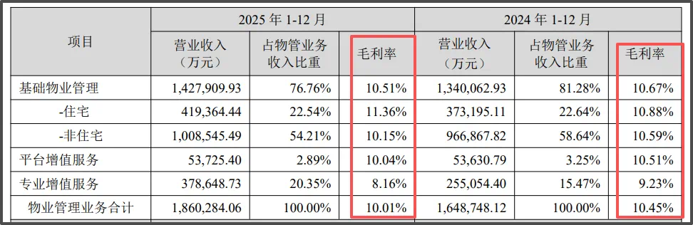 反映在盈利端,招商积余的物业管理业务毛利率从2024年的10.45%降至2025年的10.01%。其中,最为核心的非住宅基础物业管理业务毛利率仅有10.15%,同比下降0.44个百分点;专业增值服务也下降1.07个百分点,为8.16%。