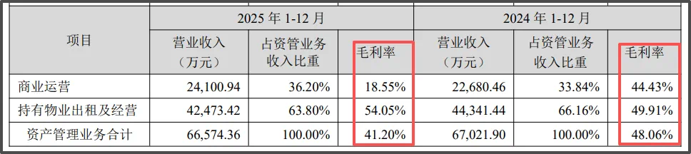 而在盈利端,2023—2025年,资产管理业务毛利率分别为50.74%、48.06%及41.20%,已连续两年下滑。其中,2025年商业运营毛利率为18.55%,同比下降约25.88个百分点。是毛利率下滑的核心原因。