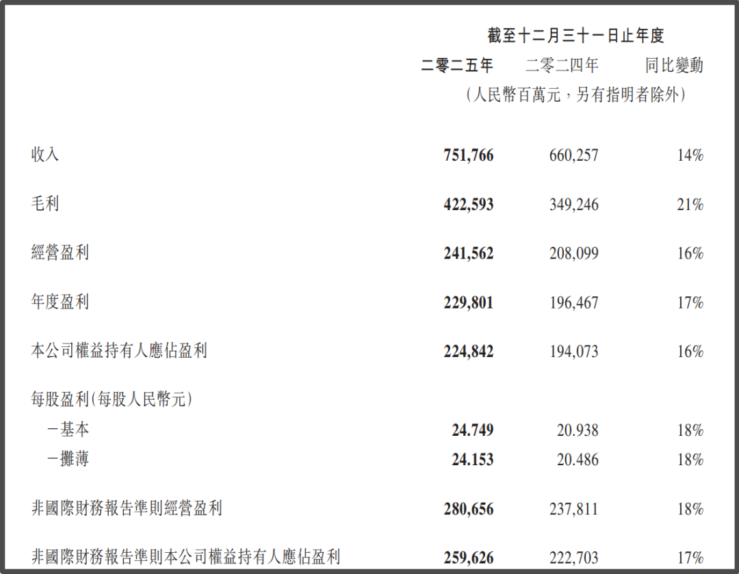 2025年腾讯实现总营收7517.66亿元,同比增长14%;归母净利润2248.42亿元,同比增长16%;全年毛利率由去年的53%提升至56%,盈利质量有所改善。
