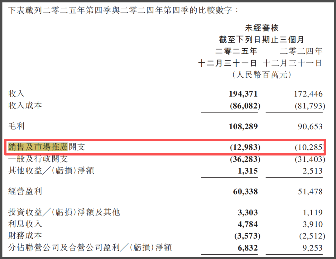 值得注意的是,腾讯在AI相关领域的投入也在持续推高成本。2025年第四季度,腾讯销售及市场推广费用同比大幅增长26%至129.83亿元,主要用于AI原生应用与新游戏推广。
