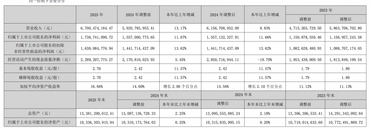 剔除因同一控制下企业合并而重述相关数据因素,2025年公司实现营业收入67.00亿元,同比上升13.17%;归属于上市公司股东的净利润17.39亿元,同比上升11.67%;归属于上市公司股东的扣除非经常性损益的净利润16.38亿元,同比增长13.62%。