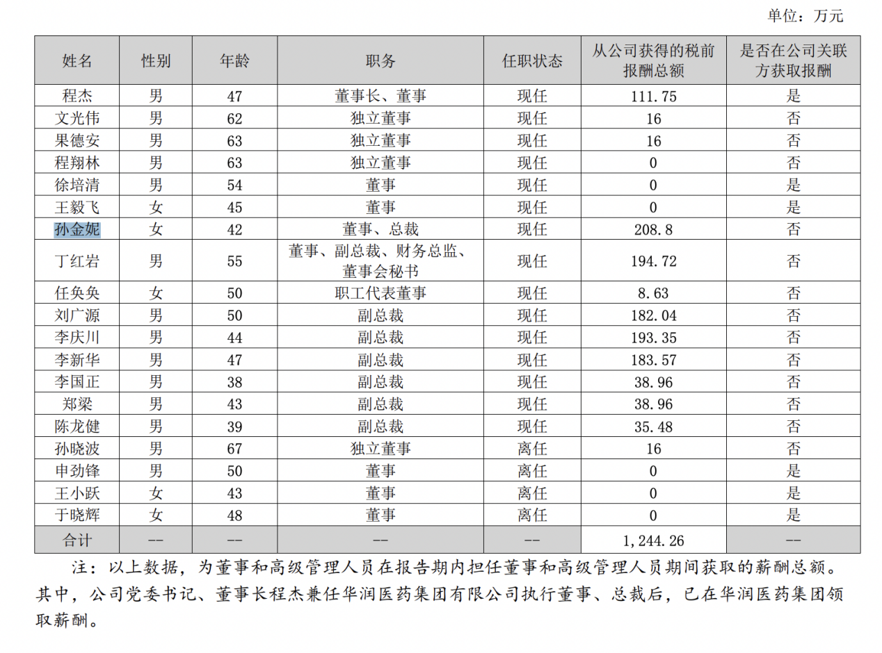 而公司董事长、董事程杰薪酬为111.75万元。另外,程杰兼任华润医药集团有限公司执行董事、总裁后,已在华润医药集团领取薪酬。