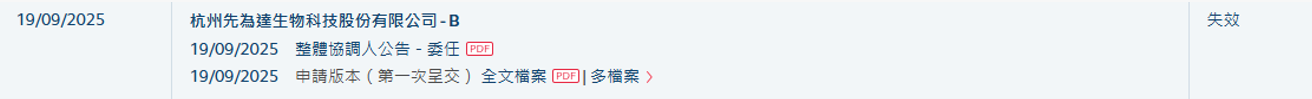 杭州先为达生物科技股份有限公司-B(简称:先为达生物)于2025年9月19日所递交的港股招股书满6个月,于2026年3月19日失效,递表时摩根士丹利及中金公司为联席保荐人。