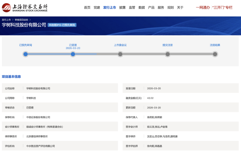 3月20日,宇树科技科创板IPO获上交所受理,保荐机构为中信证券,拟募资42.02亿元,冲刺A股“人形机器人第一股”。