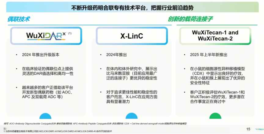 WuXiDARx™偶联技术平台:已完成从DAR4到DARx的升级,能有效提升ADC药物的均一性和工艺稳定性,并进一步增强了降本增效的核心优势。创新分子赋能方面,WuXiDARx™技术通过链间半胱氨酸位点即可生成双载荷ADC,无需抗体工程改造或酶促偶联,以单一化学平台实现CMC工艺简化,兼具高效率与成本优势。平台中的WuXiDAR1与WuXiDAR2进一步拓展应用场景边界,潜在用于AOC或APC等创新偶联分子的研发, 为创新药物研发提供强劲动能。