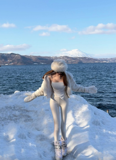 此外,Cammi日前亦上载了多张在日本滑雪的美照。虽然当地天气极为寒冷,四周白雪皑皑,但Cammi为了拍下最美状态,竟无惧严寒特意打开厚重的毛绒外套,仅穿一件贴身的白色吊带背心,大方展示其玲珑浮凸的夸张身材,在雪景的衬托下更显妩媚动人。