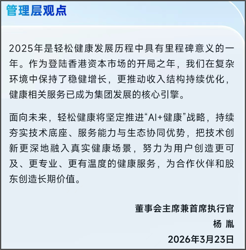 当前,市场对AI的关注正从“有没有布局”转向“能否形成经营成果”。轻松健康2025年财报所呈现出的,正是AI进入业务、支撑收入、再走向产品化的一条相对清晰的路径。