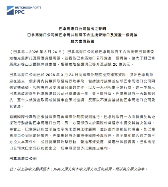 该公司指,已于周二(24日)向国际仲裁院提交补充资料,指巴拿马政府在过去一个多月内持续采取极端行政手段,包括强行接管并占领巴拿马港口公司两个货柜码头、扣押专有及受法律保护的文件,以及一系列相关不当行为,进一步显示巴拿马政府针对巴拿马港口公司已持续逾一年,并不断升级。声明指,巴拿马政府一再执意对抗,至今未就资产取用或补偿事宜予以协调,反而以不实言论针对巴拿马港口公司及其资产。