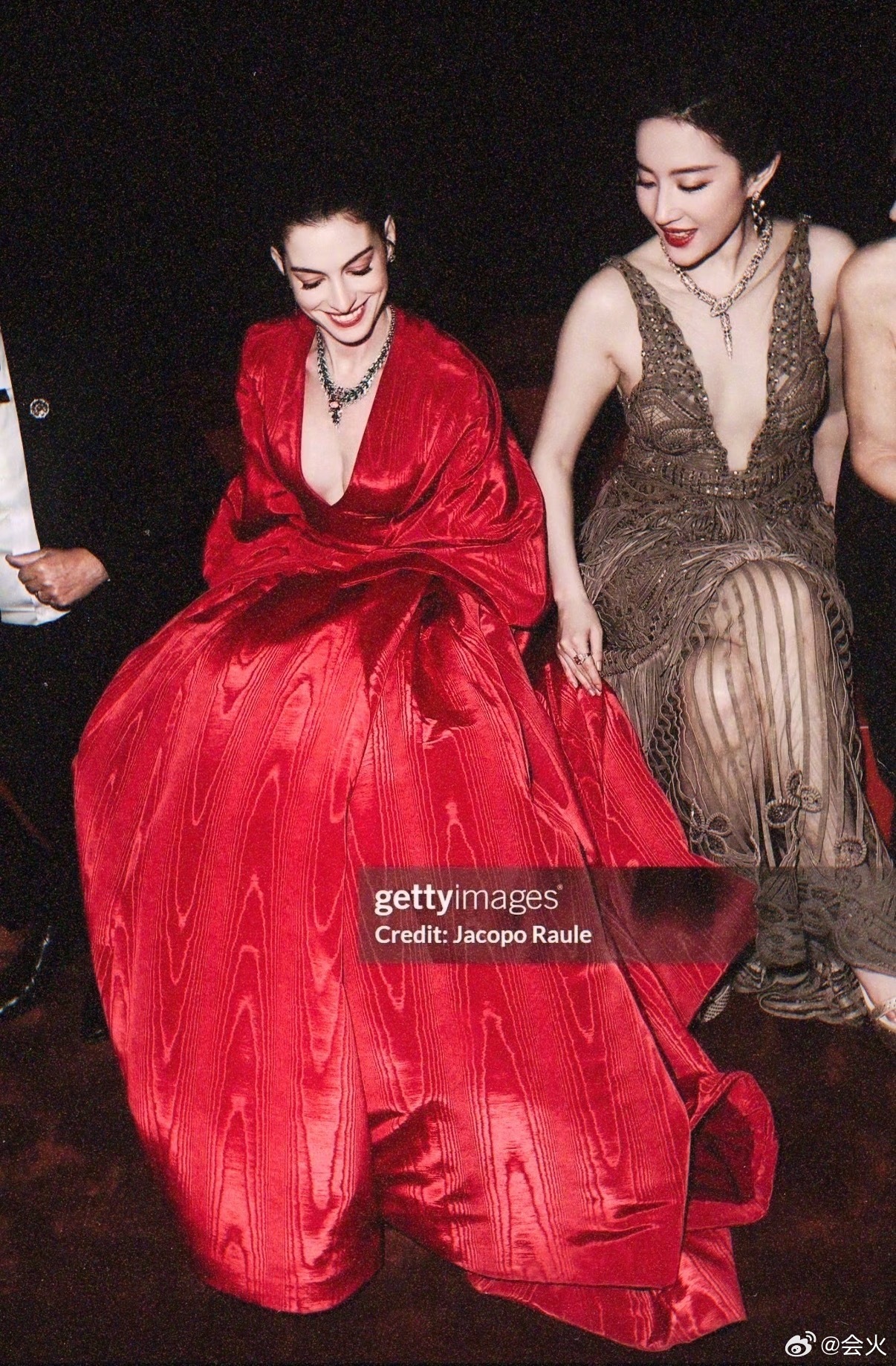当天两人的造型同样成为焦点,刘亦菲身穿深V鎏金流苏露背高订长裙,搭配盘发造型,展现优雅肩颈线条与古典气质,佩戴高级珠宝,整体造型散发温婉典雅的东方美感;安妮·海瑟薇则以一袭亮眼红色深V礼服亮相,搭配精致立体妆容与华丽珠宝项鍊,展现典型西方明星的明艳气场,两人一柔一烈的风格对比,也让画面更具视觉张力。