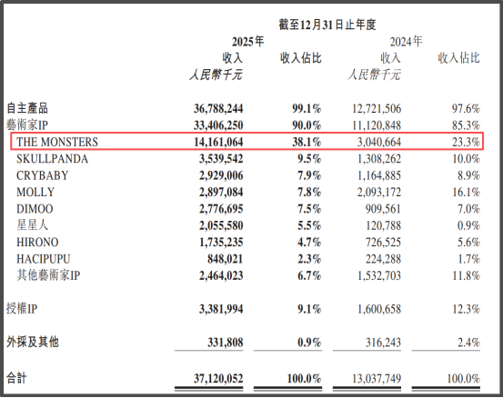 根据业绩公告,2025年泡泡玛特共有17个艺术家IP收入过亿,其中THE MONSTERS、SKULLPANDA、CRYBABY、MOLLY、DIMOO、星星人和HIRONO在报告期内分别实现收入141.61亿元、35.40亿元、29.29亿元、28.97亿元、27.77亿元、20.56亿元及17.35亿元。
