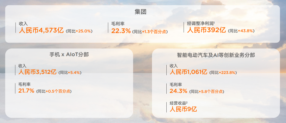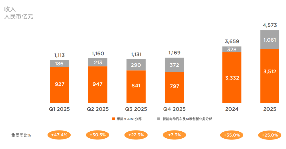 其中,手机×AIoT业务2025年全年收入达3512.17亿元,同比增长5.4%,毛利率21.7%。智能电动汽车及AI创新业务收入达1061亿元,同比增长223.8%,毛利率24.3%,同比提升5.8个百分点。