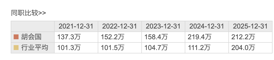 东方财富数据显示,2021年至2025年,胡会国薪酬分别为137.3万元、152.2万元、158.4万元、219.4万元、212.2万元。