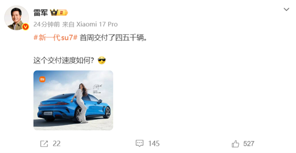 雷军今日发帖宣布,新一代SU7首周交付了四五千辆,并向网友询问,这个交付速度如何?
