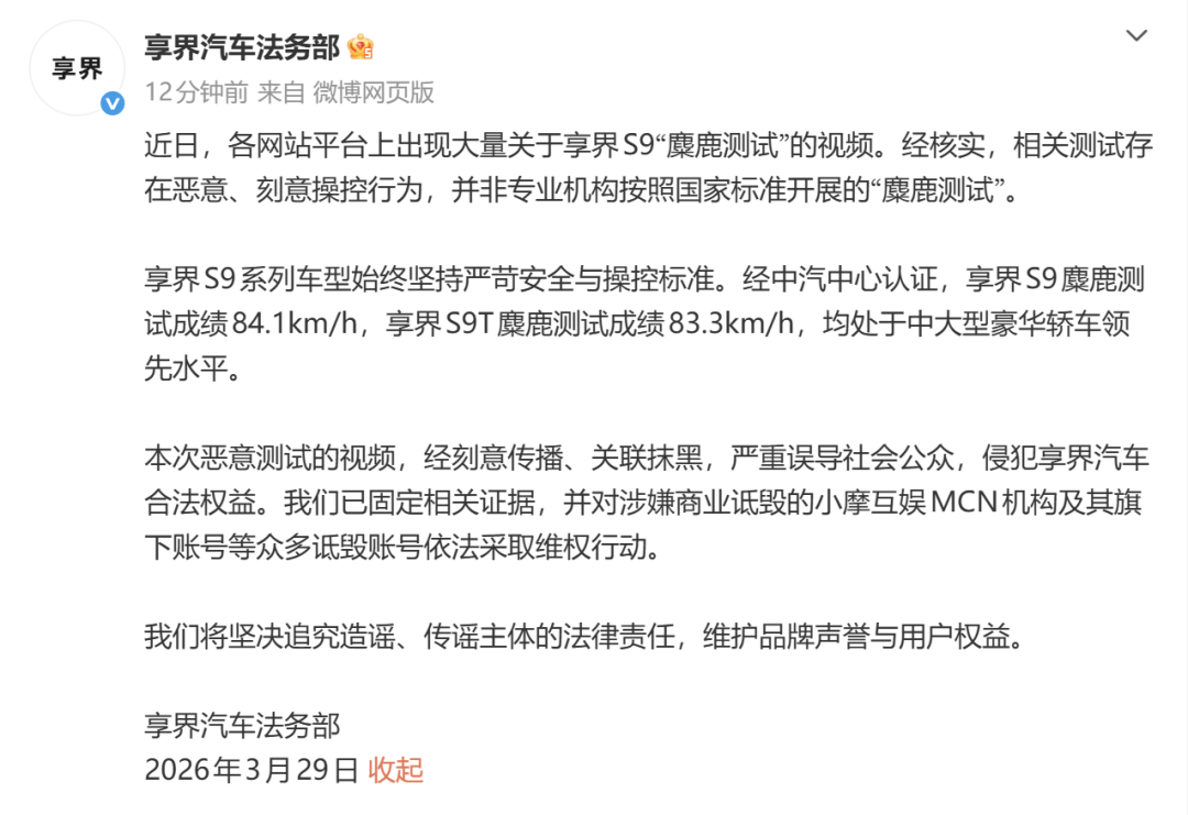 本次恶意测试的视频,经刻意传播、关联抹黑,严重误导社会公众,侵犯享界汽车合法权益。我们已固定相关证据,并对涉嫌商业诋毁的小摩互娱MCN机构及其旗下账号等众多诋毁账号依法采取维权行动。