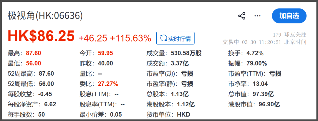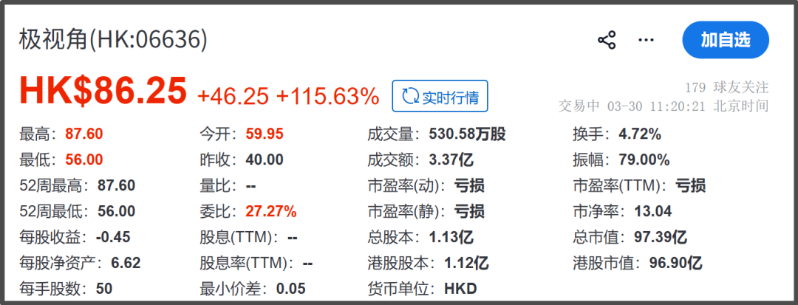3月30日,山东极视角科技股份有限公司(06636.HK)正式在港交所主板上市,以59.95港元/股高开,随即一路上扬。截至11时20分左右,极视角报86.25港元/股,上涨115.63%,总市值97.39亿港元。