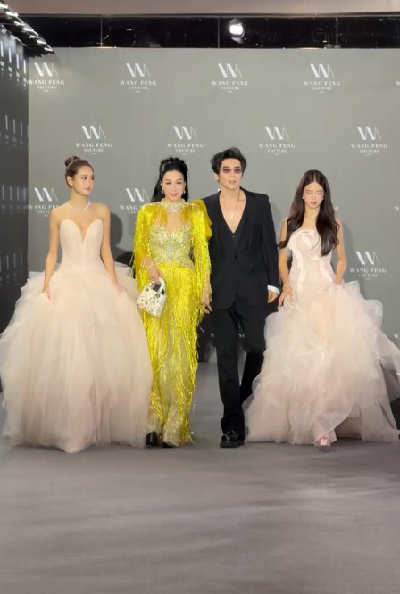 活动当日,钟丽缇一家人可谓悉心打扮,盛装登场。从影片中可见,钟丽缇穿上一袭抢眼的荧光黄色钉珠流苏长裙,配上精致妆容,尽显雍容华贵。身旁的两位女儿Jaden和Cayla则分别穿上不同款式的粉色系公主纱裙,Jaden的低胸大裙摆设计散发小女人味,Cayla的简约设计则更显清纯,两姊妹仙气飘飘,完美展现青春美貌。后父张伦硕则以型格全黑西装登场,一家人颜值超高,并排而行,画面美不胜收。