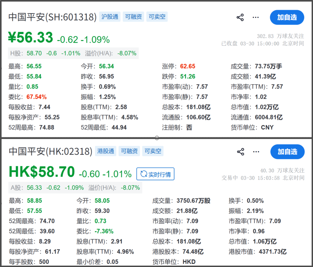 3月30日,中国平安A股及港股开盘后均一路走低,截至当日15时,港股报58.7港元/股,下跌1.01%;A股报56.33元/股,下跌1.09%。