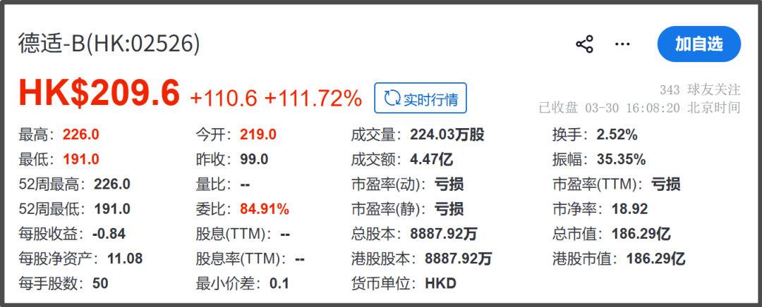 3月30日正式挂牌后,德适生物一路高开高走,盘中涨幅一度超124%,股价触达222港元/股,截至当日收盘,股价报209.6港元/股,涨幅111.72%,总市值186.29亿港元。