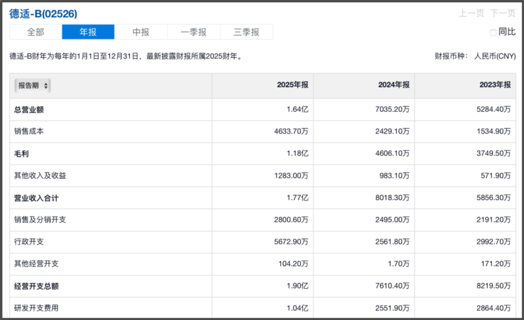 但从财务数据来看,德适生物目前仍处于未盈利的早期阶段,2023-2025年前9个月营收分别为0.53亿元、0.7亿元、1.12亿元,其中2025年前9个月收入规模大涨,源于技术许可贡献收入占总营收比重达到51.4%,成为该公司现阶段的主要收入支撑。