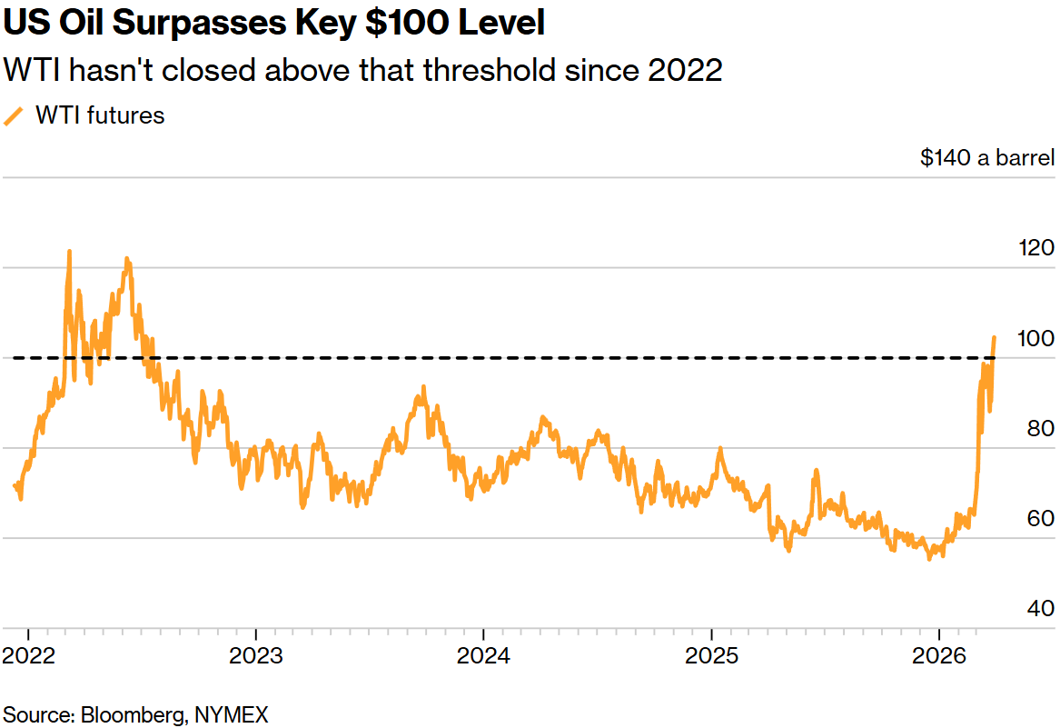 自美国与以色列对伊朗发动战争以来,美国油价在周一交易时段首次收于每桶 100 美元以上。与此同时,美国总统特朗普威胁要进一步升级袭击,其目标包括关键的能源基础设施。