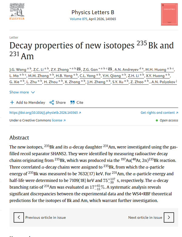 该研究为理解重核区原子核的核结构、衰变特性等提供了重要实验依据,进一步拓展了核素的认知版图,相关成果发表于《物理快报B》。