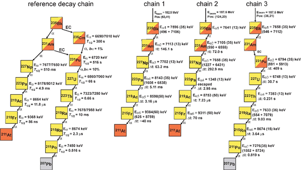 基于单原子核灵敏的探测鉴别技术,团队观测到三条具有能量-位置-时间关联的阿尔法衰变链,首次测量了锫-235和镅-231的阿尔法衰变粒子能量分别为7632 keV和7109 keV,并测量了镅-231的半衰期为75秒、阿尔法衰变分支比为17%。
