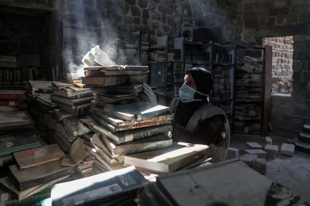 ▲3月2日,巴勒斯坦志愿者在加沙城一处遭战争损坏的图书馆内整理图书。新华社