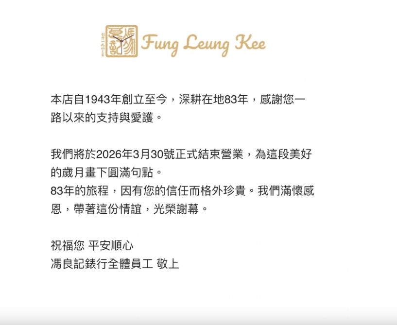 在结业公告中,冯良记向所有顾客致以最诚挚的感谢:“本店自1943年创立至今,深耕在地83年,感谢您一路以来的支持与爱护。”公告中充满感恩之情,表示因为顾客的信任,这段漫长的旅程才显得格外珍贵。最后,表行以“我们满怀感恩,带着这份情谊,光荣谢幕”作结,为超过八十年的经营历史写下圆满的句号。