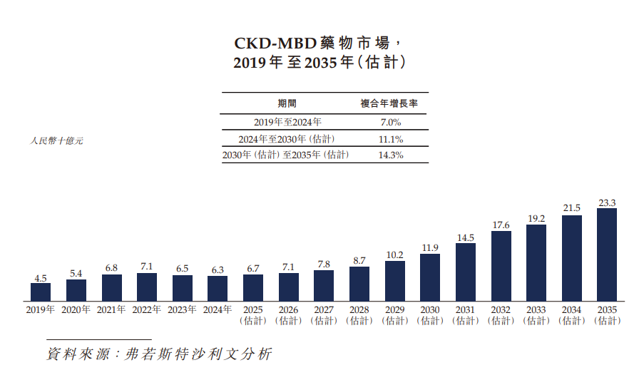 全球SHPT治疗及CKD-MBD治疗市场有望在未来数年产生年销售额达数十亿美元的重磅药物。预计2024年至2030年期间,该等细分市场的复合年增长率将分别超过15%及10%。