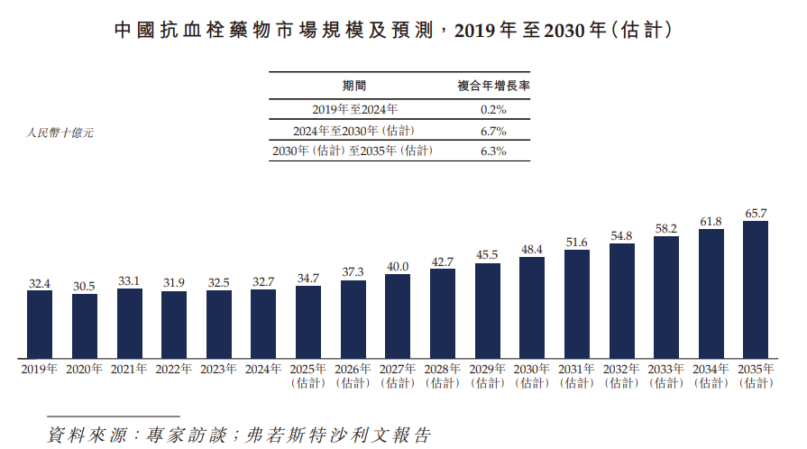 2024年,中国抗血栓药物市场规模达到人民币327亿元。估计中国抗血栓药物市场将于2030年增至人民币484亿元,并于2035年增至人民币657亿元,2024年至2030年的复合年增长率为6.7%,2030年至2035年的复合年增长率为6.3%。
