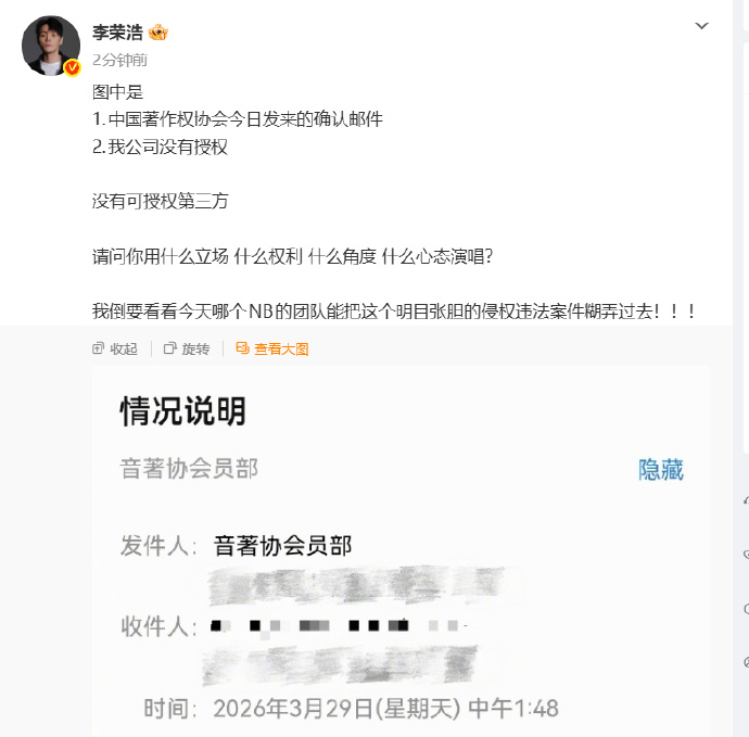 这个回应显然让李荣浩不满。李荣浩再次在微博发声,并放出中国著作权协会发来的“情况说明”截图,图片中,中国音乐著作权协会明确提到,“协会未就该作品(《李白》)发放任何授权。”