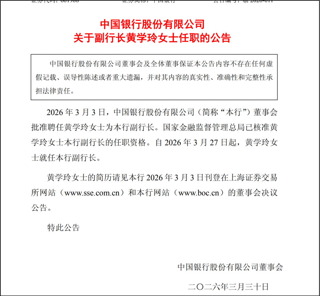 同日,中国银行发布公告,金融监管总局已核准黄学玲担任副行长的任职资格,其自3月27日起正式履职。公开资料显示,黄学玲为北京大学经济学硕士,2020年4月至2025年7月任中央汇金投资有限责任公司资本运营部主任,兼任中央汇金资产管理有限责任公司董事长、总经理;2025年7月至2026年2月任中央汇金股权管理二部主任,2026年加入中国银行。
