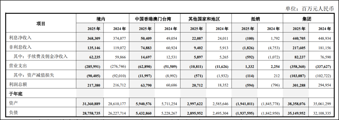 其中港澳台地区业务表现稳健,净利息收入由490.54亿元增至504.09亿元,同比增长2.8%。2025年末,港澳台地区资产总额59405.76亿元,较上年末增加2293.22亿元,增长4.02%;实现利润总额637.90亿元,同比增加31.04亿元,增幅5.11%。
