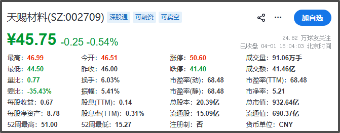 4月1日,天赐材料A股收盘报45.75元/股,微跌0.54%,总市值932.64亿元。