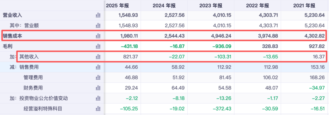 也正是对在建物业及持作销售的已落成物业计提减值等影响,2025年碧桂园销售成本为1980.11亿元,较总营收高出431.21亿元,因而形成了毛利亏损,若剔除该等物业减值净额对毛利的影响,碧桂园2025年的毛利约为13.89亿元。