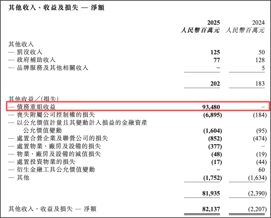 《星岛》从财报关注到,2025年碧桂园获得来自债务重组的收益约为934.8亿元,与其他收益项综合后,为碧桂园贡献了821.37亿元的其他收入净额。