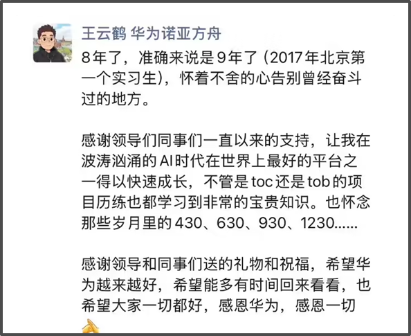 3月28日,王云鹤在朋友圈发文告别,正式官宣从华为离职。“8年了,准确来说是9年了(2017年北京第一个实习生),怀着不舍的心告别曾经奋斗过的地方。感谢领导们同事们一直以来的支持,让我在波涛汹涌的AI时代在世界上最好的平台之一得以快速成长。”