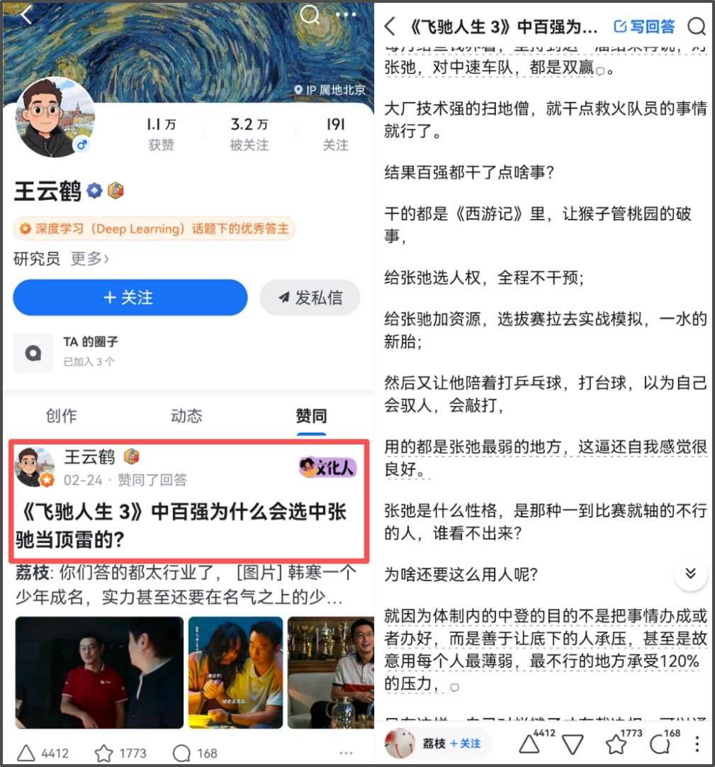 《星岛》注意到,就在离职官宣的前一个月,王云鹤在知乎上悄悄点赞了一个回答,回答的问题是——《飞驰人生3》中百强为什么会选中张弛当顶雷的?