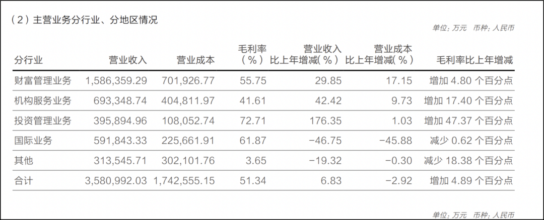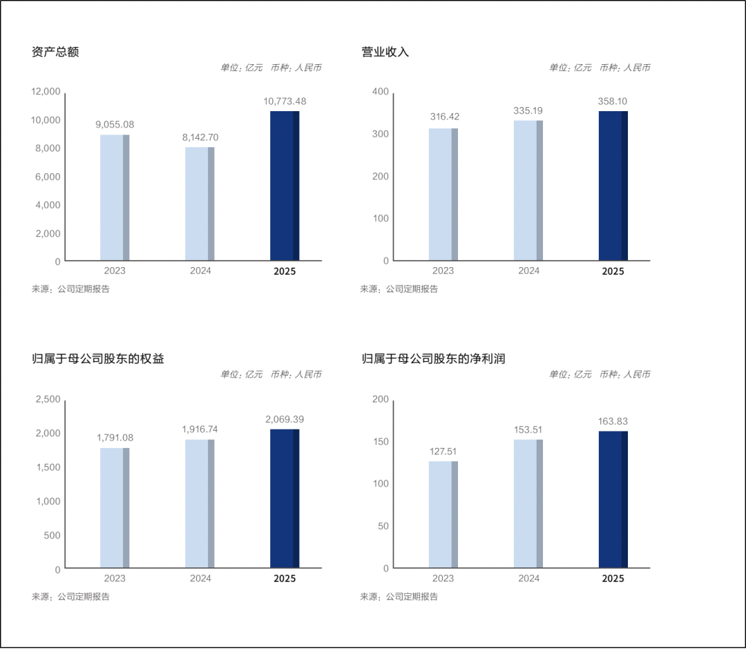 2025年,华泰证券实现归母净利润163.83亿元,同比增长6.72%;截至2025年末,公司总资产规模突破万亿元大关,达到1.08万亿元,较2024年末增长32.31%。其中,作为营收支柱的财富管理业务表现尤为亮眼,报告期内该业务实现收入158.64亿元,同比增长29.85%,占公司总营收的比例高达44.30%。