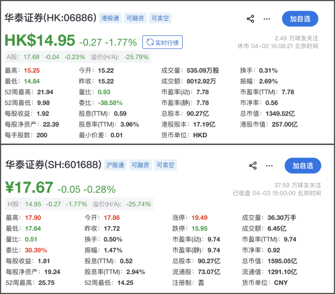 截至4月3日收盘,华泰证券A股报17.67元/股,跌0.28%,总市值1595.05亿元;港股截至4月2日收盘,报14.95港元/股,跌幅1.77%,总市值1349.52亿港元。