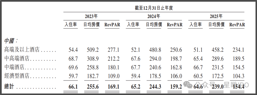 从酒店三项关键指标看,2023年至2025年,锦江酒店在中国的平均可出售客房收入分别为169.1元、159.2元、154.4元,日均房价为255.6元、244.3元、239元,入住率分别为66.1%、65.2%、64.6%,均呈现下滑趋势。