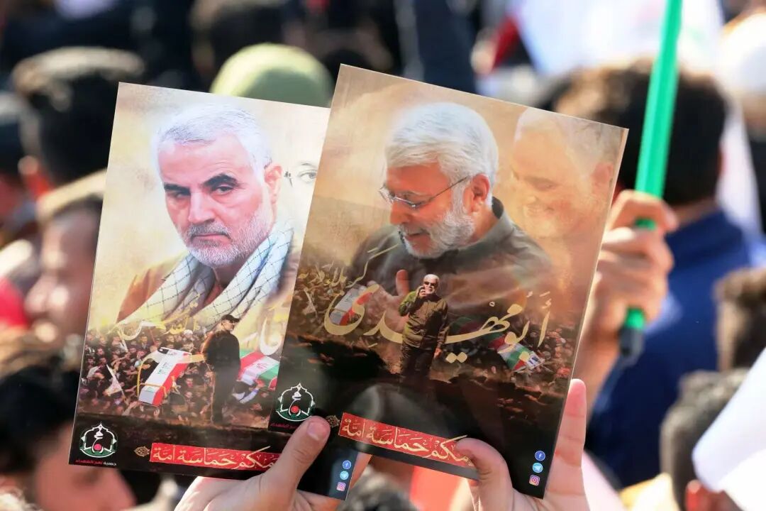 ▲2021年1月3日,在伊拉克巴格达,人们手举苏莱曼尼和穆汉迪斯形象的海报参加苏莱曼尼和穆汉迪斯遇袭身亡一周年悼念活动 图据新华社