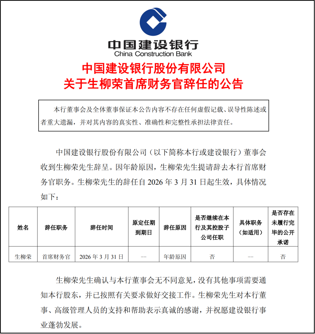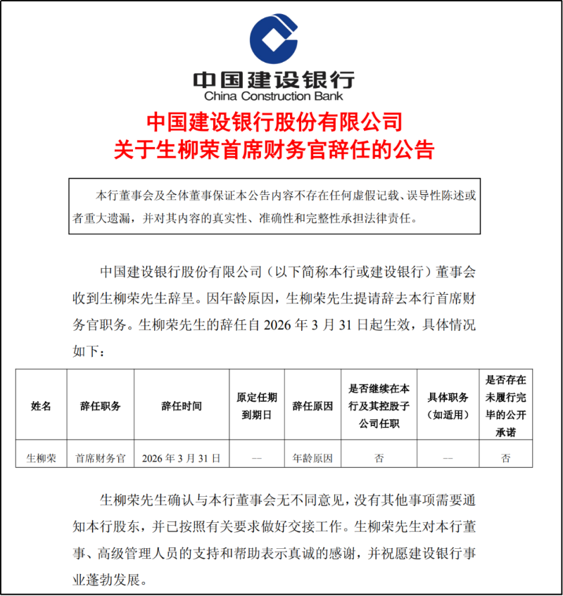 3月31日下午,建设银行(601939.SH,00939.HK)发布公告,宣布首席财务官生柳荣因年龄原因正式离任,其辞任自当日起生效。
