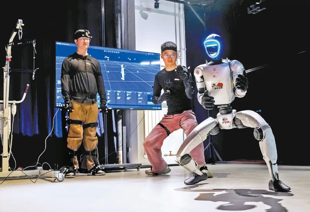 诺亦腾机器人的工作人员演示通过动作捕捉技术控制的协作机器人(供图 | 新华社)